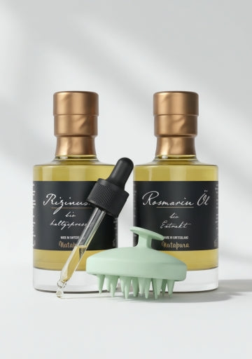 Allein sind sie stark – zusammen unschlagbar. Rizinusöl dringt tief in die Haarwurzel ein, nährt und kräftigt von innen. Rosmarinöl aktiviert die Durchblutung der Kopfhaut und weckt ruhende Haarfollikel aus ihrem Schlaf. Studien zeigen: Rosmarinöl kann genauso effektiv sein wie bekannte Haarwuchsmittel – nur eben 100% natürlich und ohne Nebenwirkungen. Gemeinsam schaffen diese beiden Öle die optimalen Bedingungen für neues, gesundes Haarwachstum.